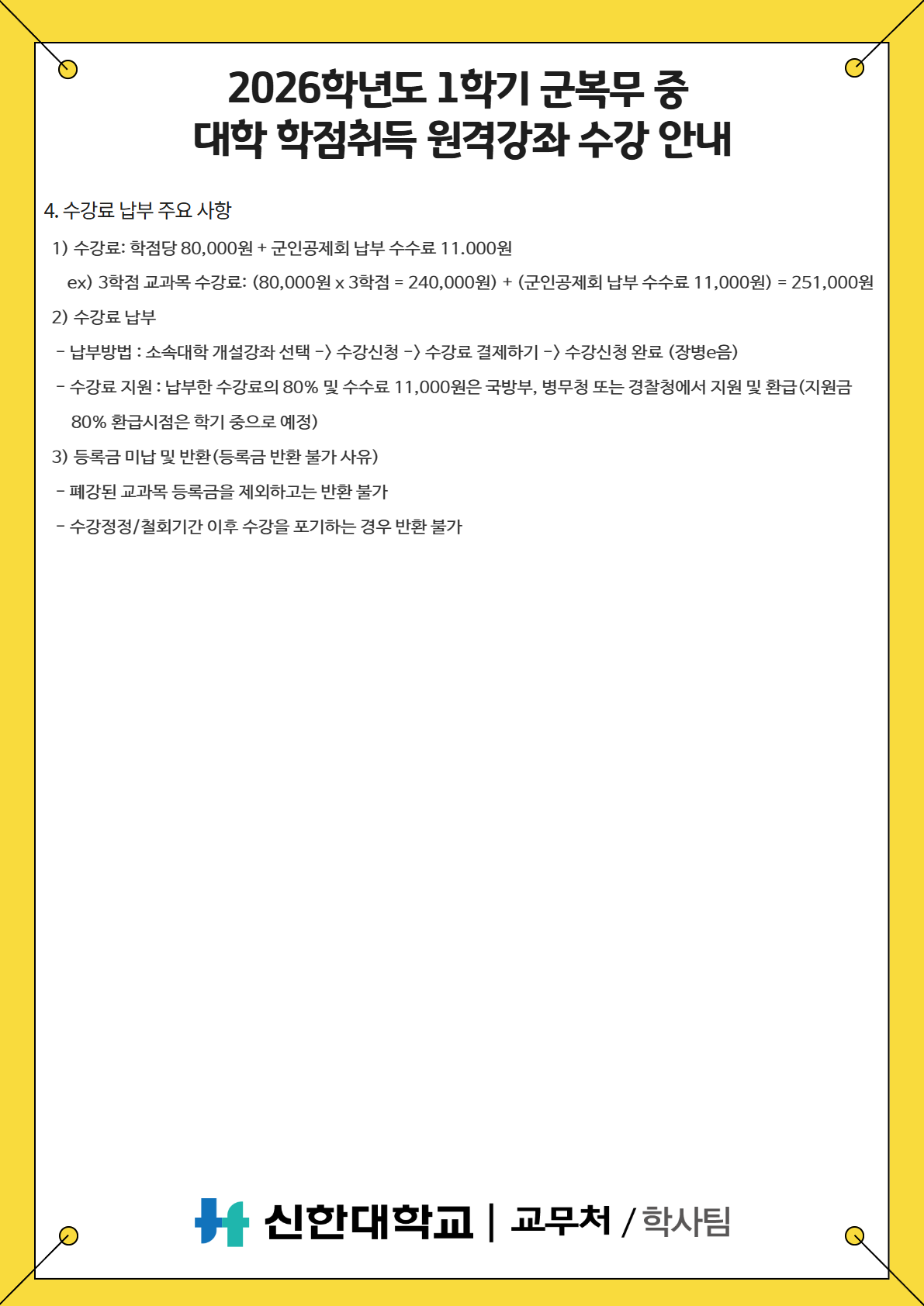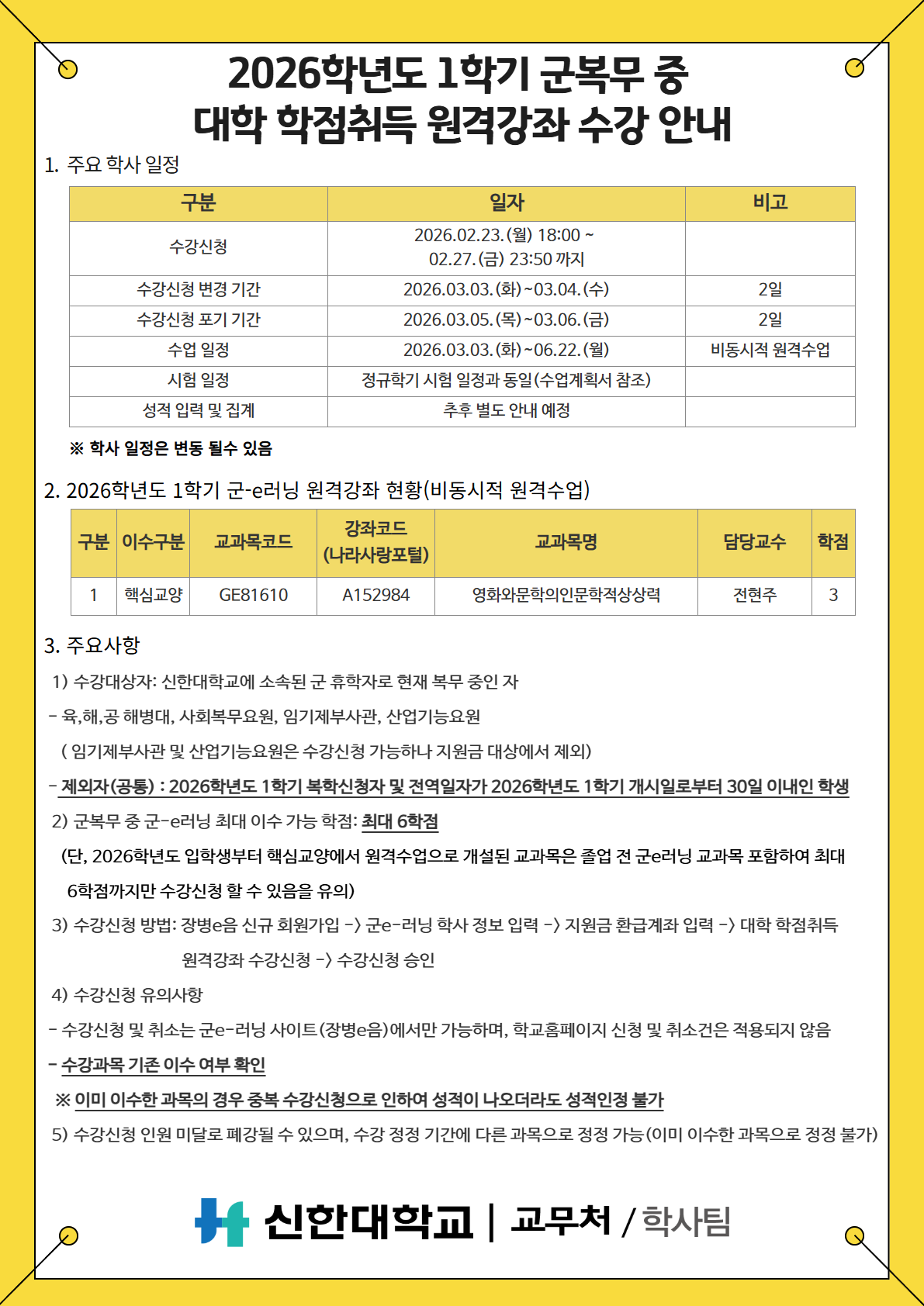 [학사팀/수업] 2026학년도 1학기 군 복무 중 대학 학점취득 원격강좌 수강 안내