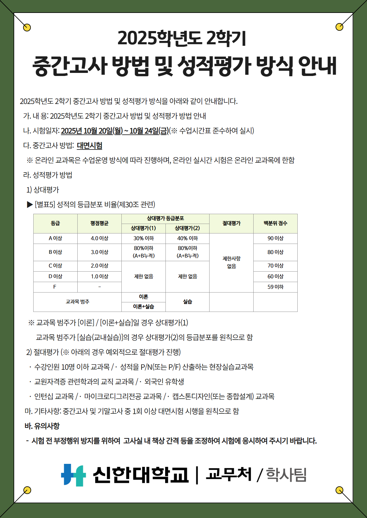 [학사팀/시험] 2025학년도 2학기 중간고사 방법 및 성적평가 방식 안내